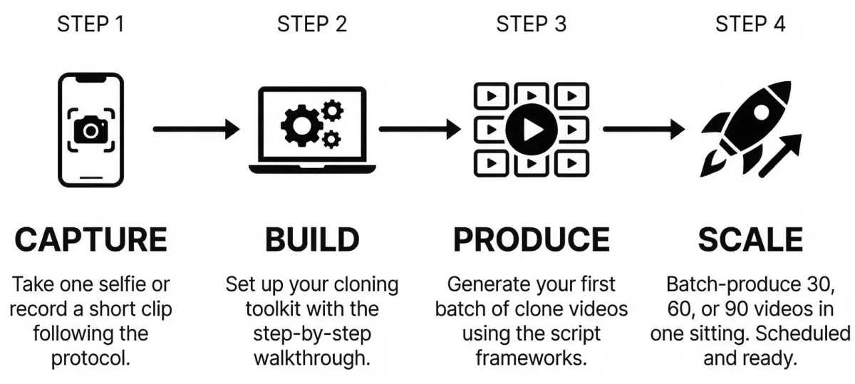 Step 4: Scale You activate the The Clone Engine and batch-produce 30, 60, or 90 videos in a single sitting, optimized per platform, scheduled and ready to go.