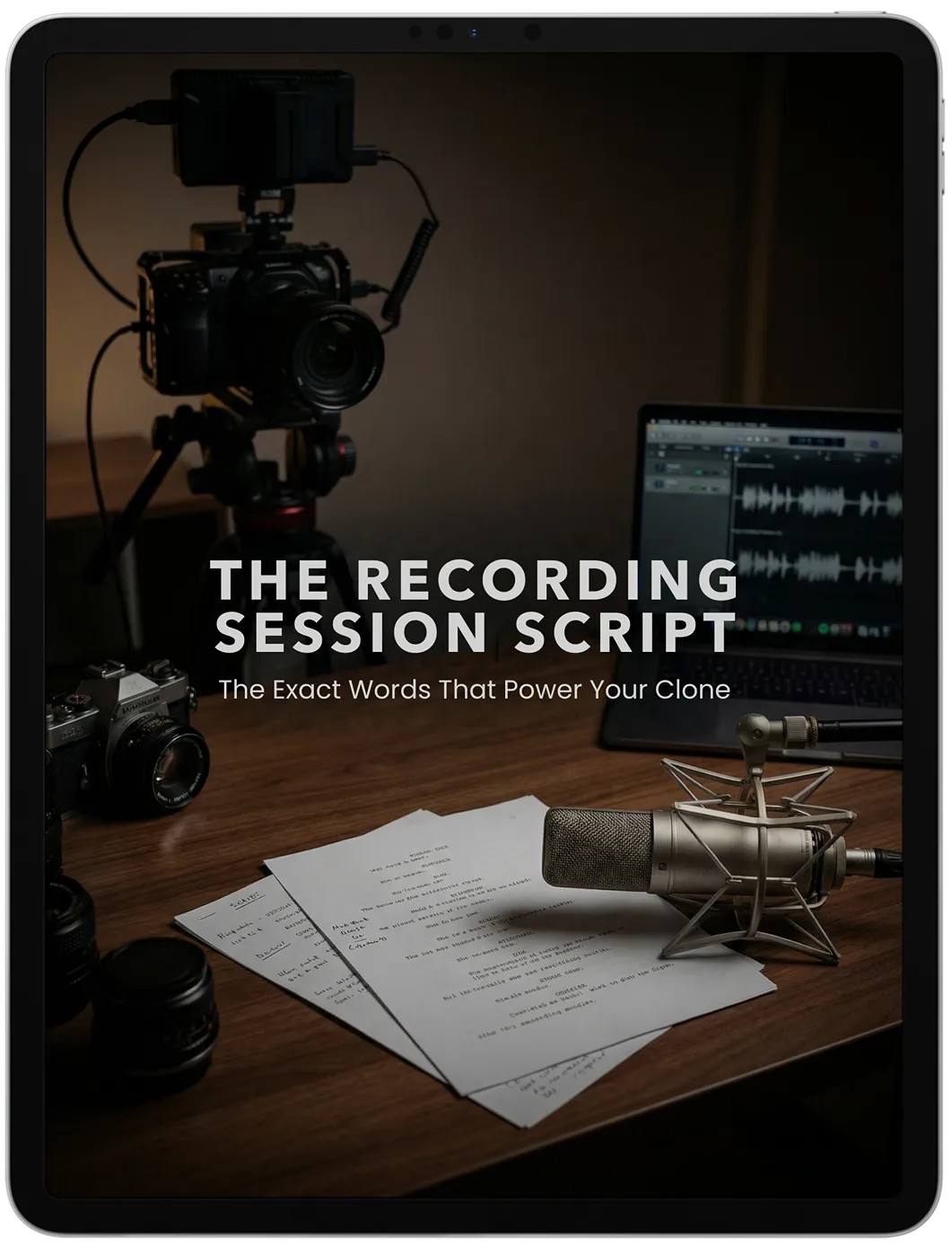 The Single-Session Clone Protocol™ The exact selfie and recording method that gives AI everything it needs to build a clone virtually indistinguishable from you. One take. Done forever (Value: $197)